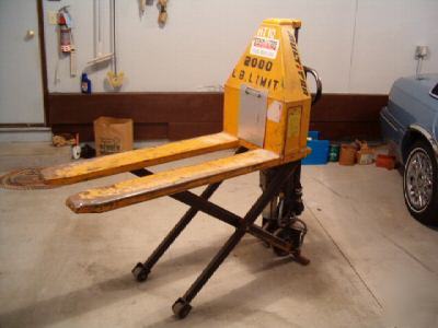 You are looking at very nice MULTITON pallet jack lift. This unit in in very good shape. The battery is one year old, and has a charger. The truck will lift from floor to 31". Once the truck lifts it's load, the whels will not roll. It is manual push, hydraulic lift. The overall fork space outside to outside is 20" the forks are 6" wide.
